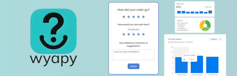 This plugin connects your WooCommerce store to the Wyapy service, where you can manage surveys, questions and analytics.